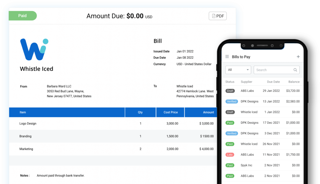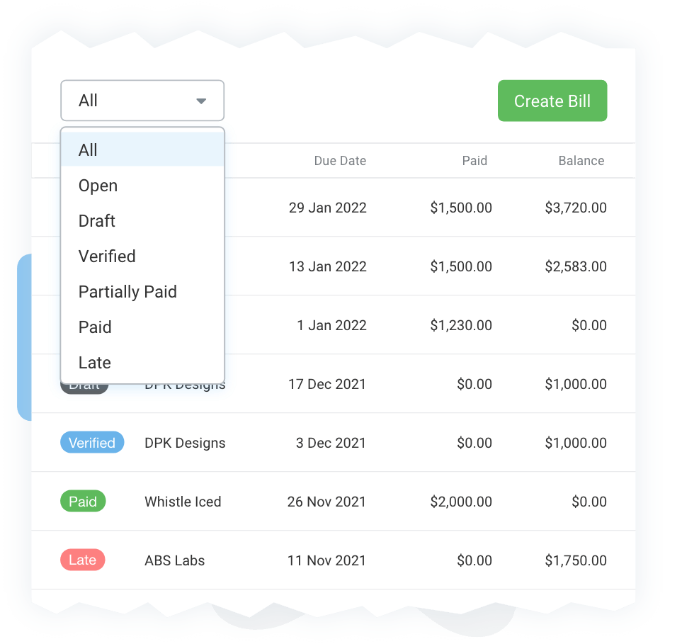 - Stay on top of your business’s cash flow and see all bills that are due for payment.