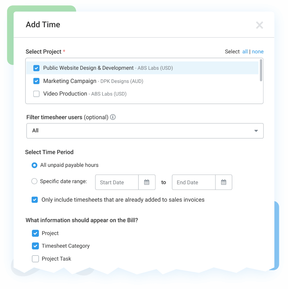 - Add approved time at configured cost rate on each project tracked by supplier contacts as bill line items.