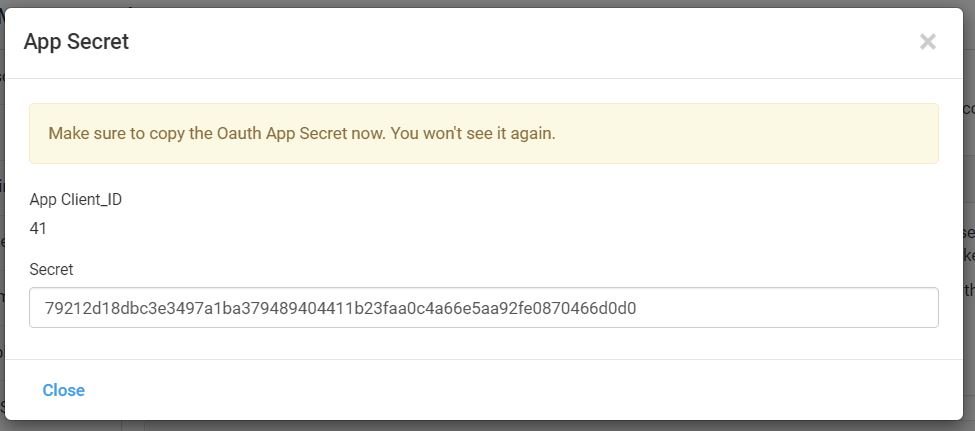 Click Save to create the app. The App Client ID and App Secret will be displayed on screen. Please note that the App Secret will not be displayed again so you must copy and paste it safely. The Secret is used for the Authorization Code flow, and adds an extra layer of security for server-to-server implementations.