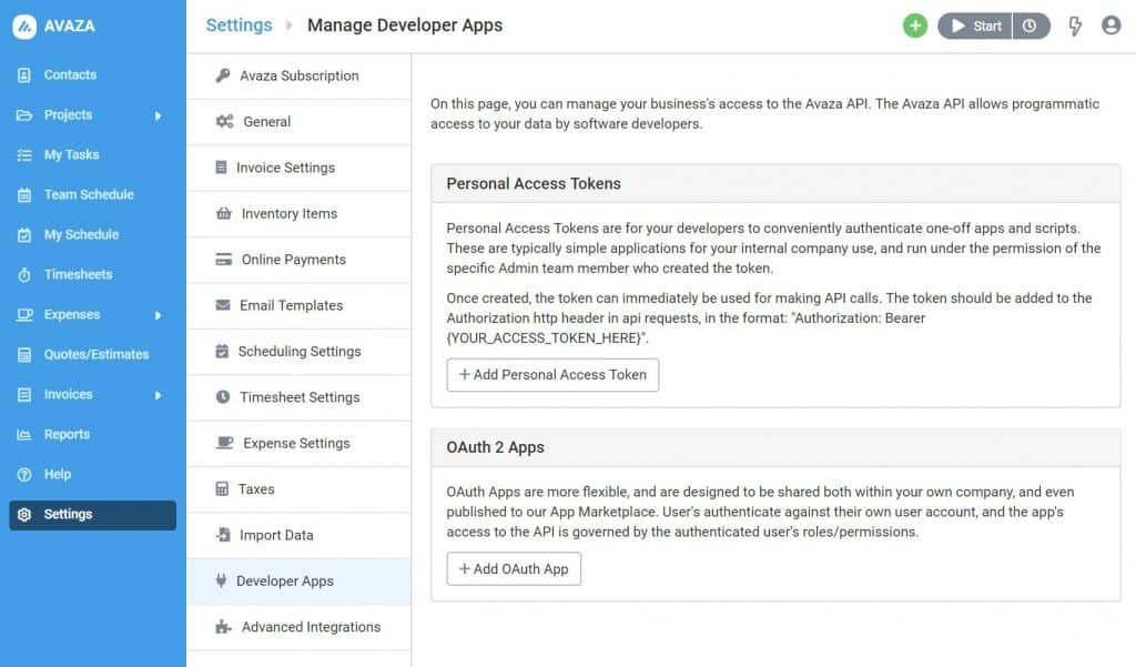 Avaza also supports Personal Access Token method for your developers to conveniently authenticate one-off apps and scripts. You can learn more about this method by following this link.