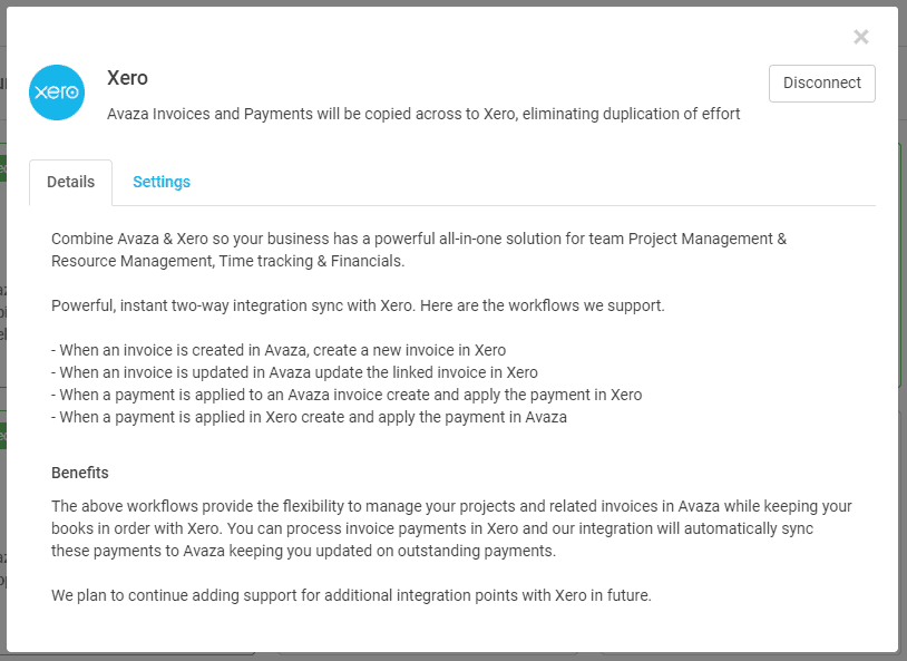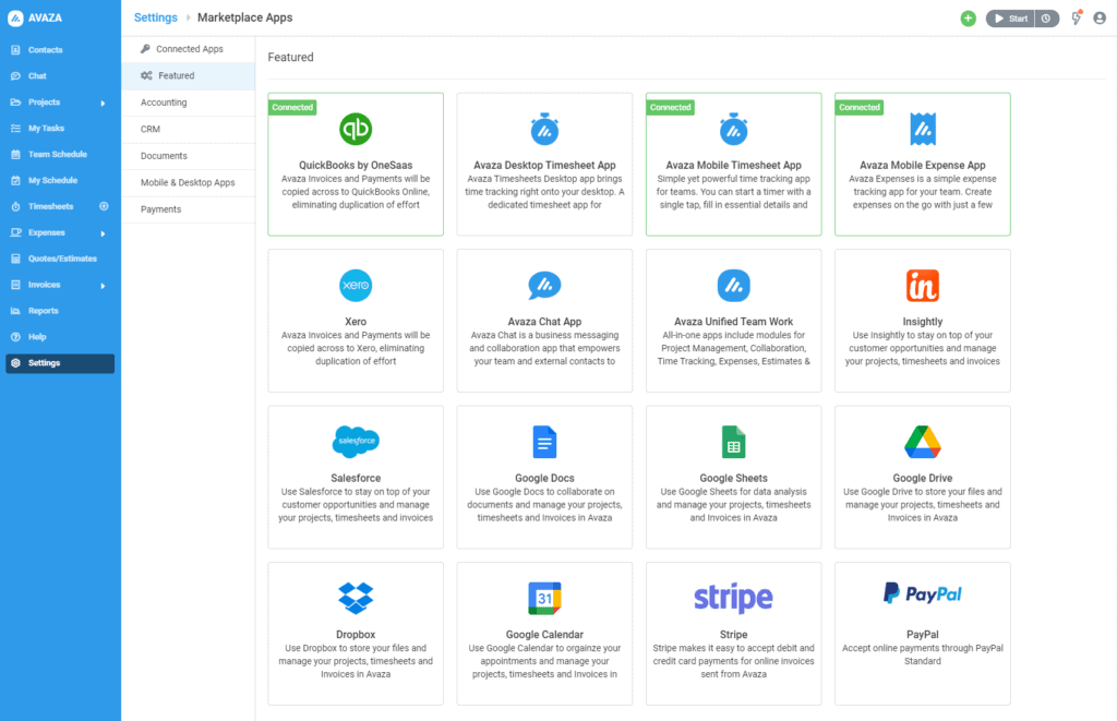 We will be expanding the lineup of integrations. Third party developers who have built apps that integrate with Avaza can request to have their app listed on the Marketplace.