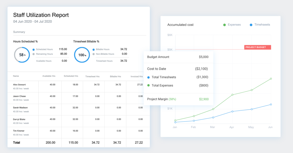 Maximize team efficiency by regularly analyzing the Staff Utilization report. By comparing billable vs. non-billable hours and scheduled hours, you can make informed decisions about resource allocation.
