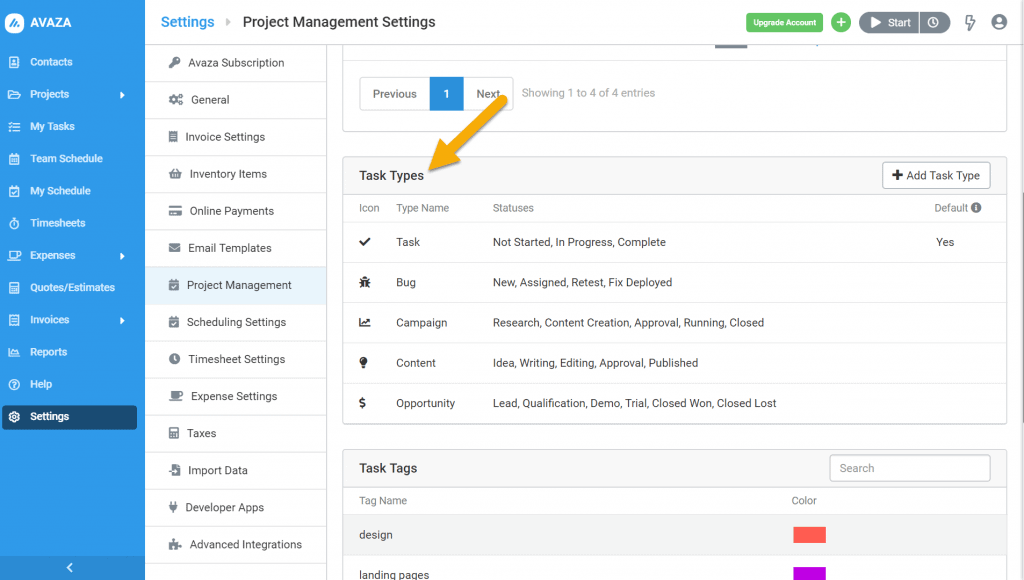Avaza’s Task Types feature offers enhanced flexibility and specificity in task management.