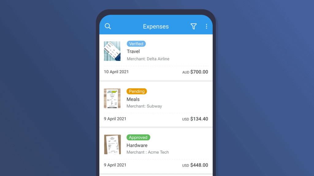 See where you are spending money for a given date range. View breakdown of expenses by Category, Merchant, Customer, Project and more with just a tap.