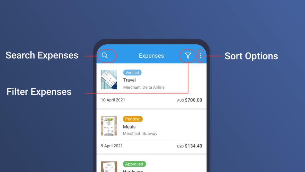 Search: Enter the Merchant name or Expense Category in the search box to quickly filter the list for those expenses.