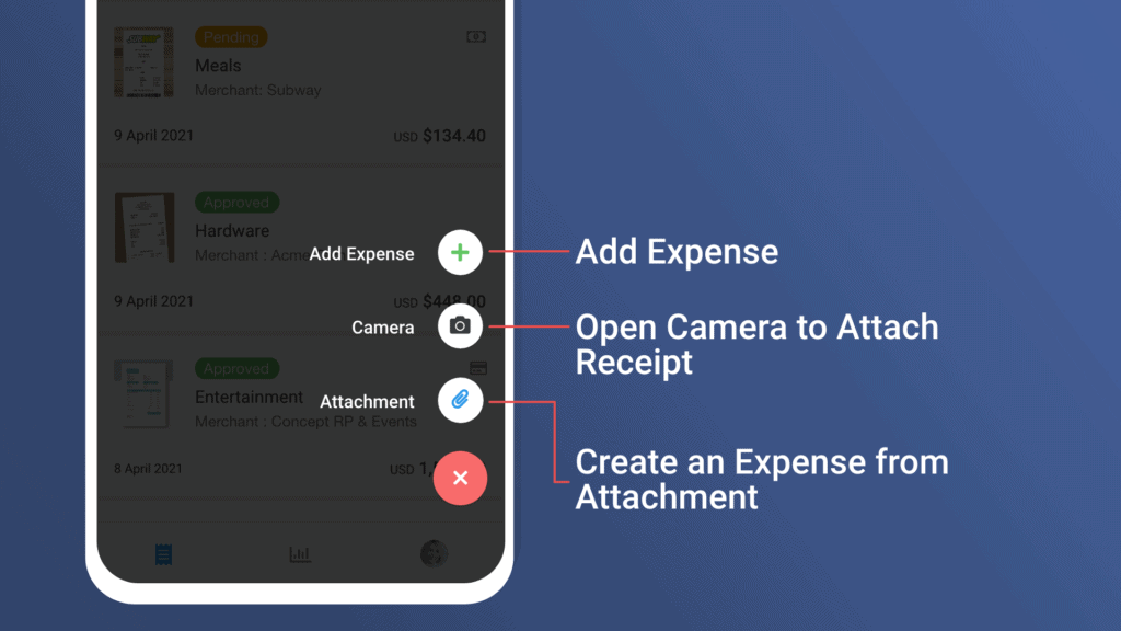 3. Attachment – Select from existing photos or documents on your phone and continue creating the expense with the selected file attached to the expense