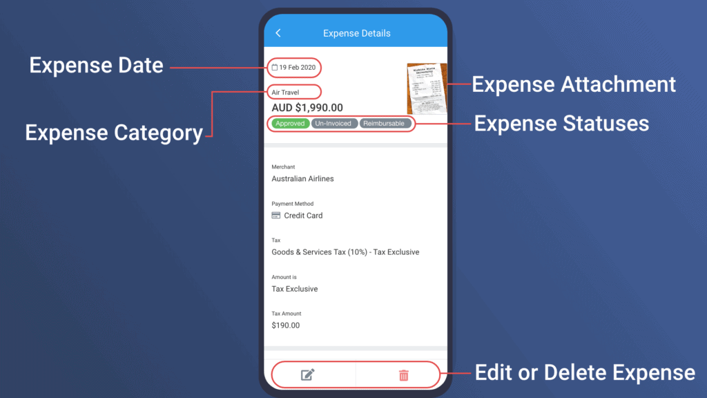To view the expense details, tap an expense record from the list. The expense details page will display all details related to that expense in a structured manner. Relevant actions such as editing, deleting etc will be available at the bottom of the page. The user can tap the image to see a larger preview or download the original file.