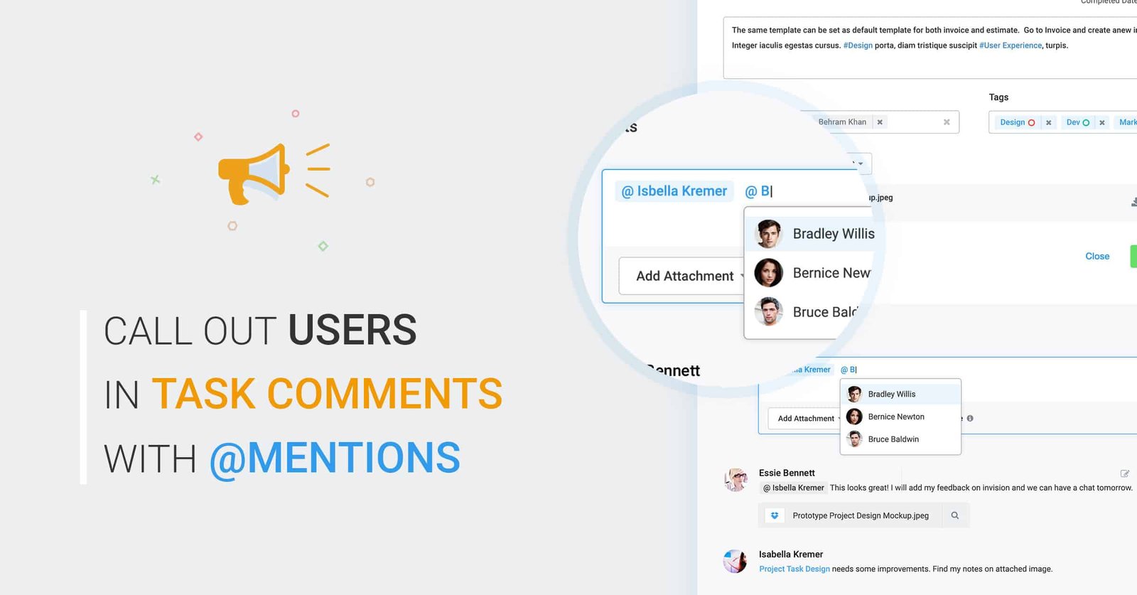 Tag team members using our new @mention functionality to ensure no one misses out on an important task comment.