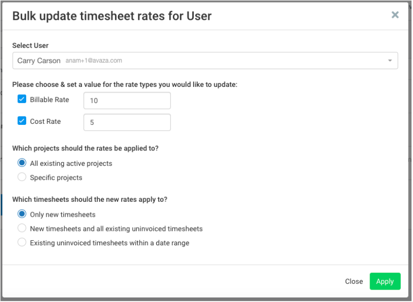 - A popup will appear that will allow you to apply the specified cost and billable rate to all or specific projects and uninvoiced timesheets.