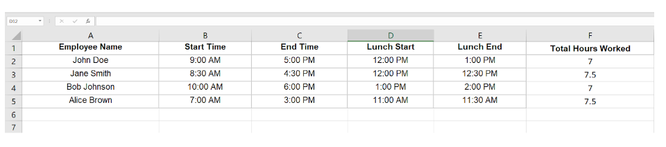 • Enter the start time, end time, lunch break start time, and lunch break end time in Columns B, C, D, and E, respectively.