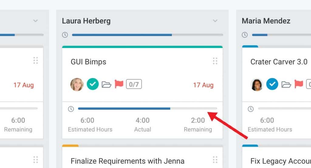 Similar to the task list view, KanBan view displays the time widget as line progress graph for each grouping column that has either task estimate or actual tracked hours.