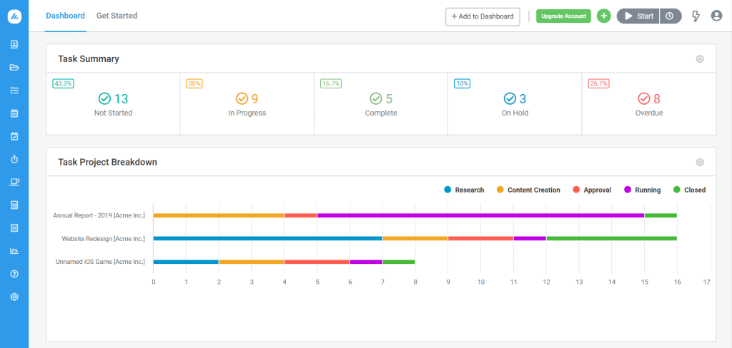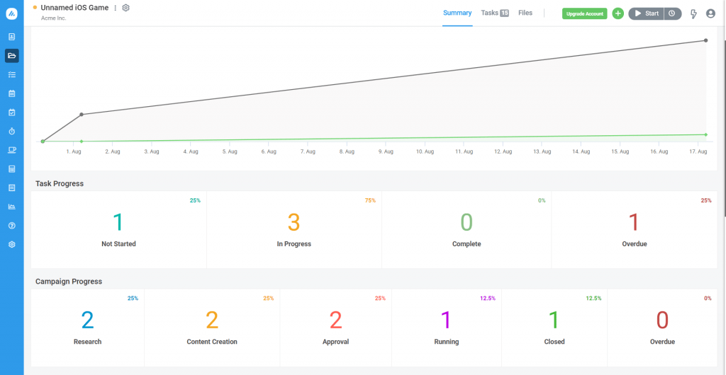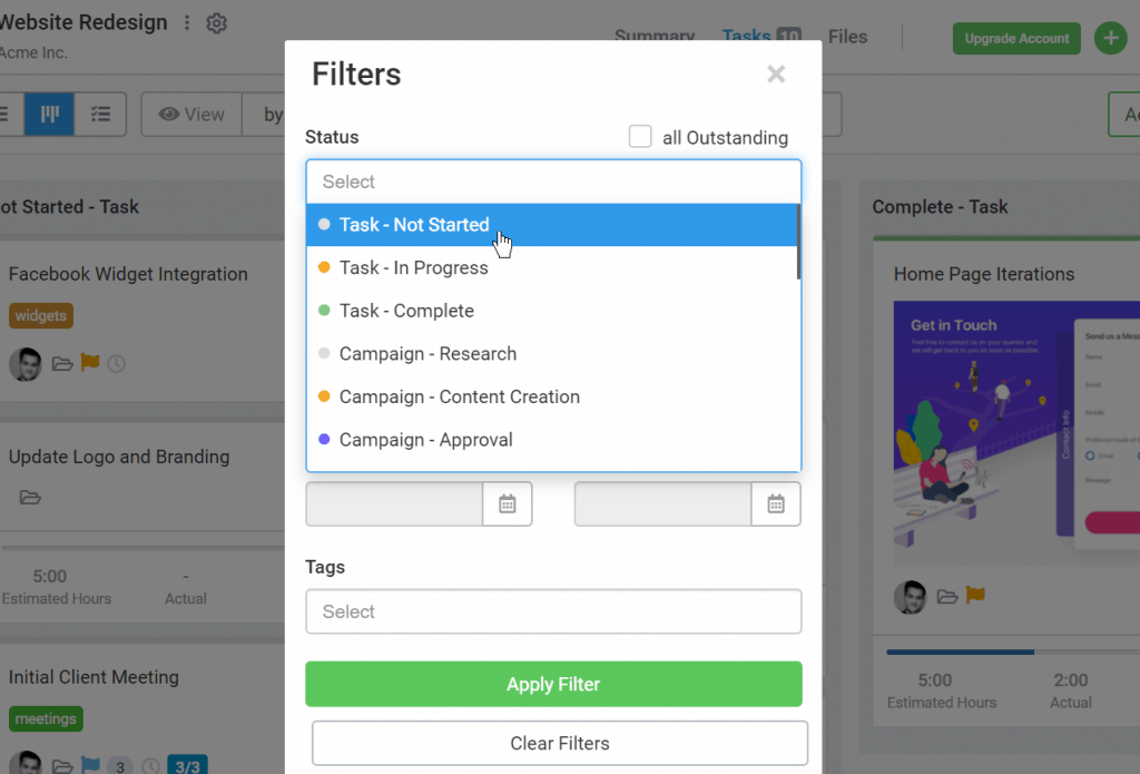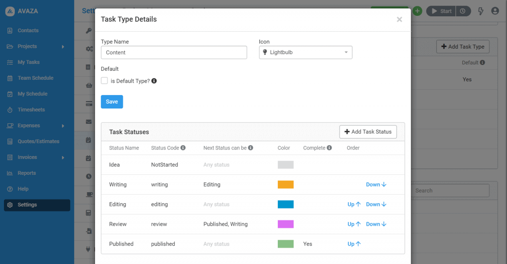 Initially your account starts with one Task Type called “Task” created with three statuses “Not Started”, “In Progress”, “Complete” that reflect a basic status lifecycle. However, your account Administrator can create new Task Types and configure custom task statuses to suit your business by navigating to Settings > Project Management Settings page.