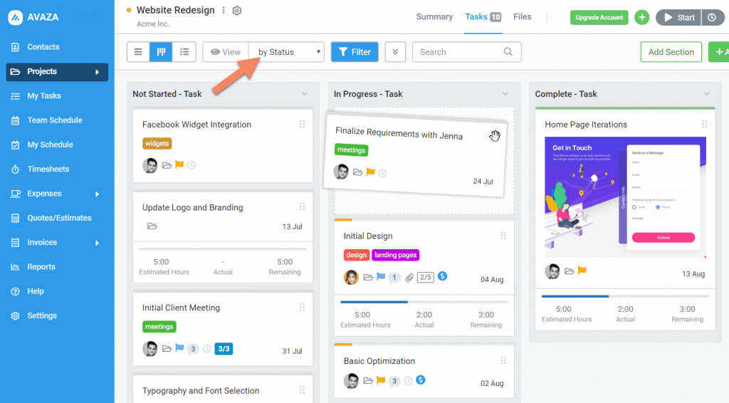 All Projects & My Tasks views (List, KanBan, Gantt) support grouping tasks list by Status. User can drag and drop between allowed statuses and order the tasks.