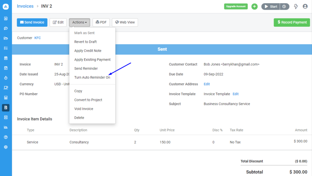 To turn Invoice Auto Reminders On or Off on any existing invoice, open the invoice and from the Invoice Details page, click the Actions dropdown and select the available auto reminder option.