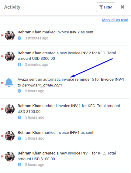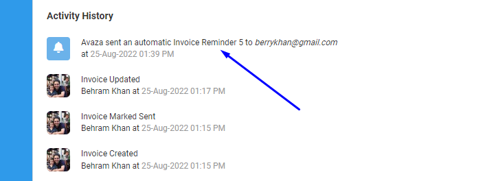 The Invoice Activity History section and User Activity panel list each Invoice Auto Reminder that has been sent thus far.