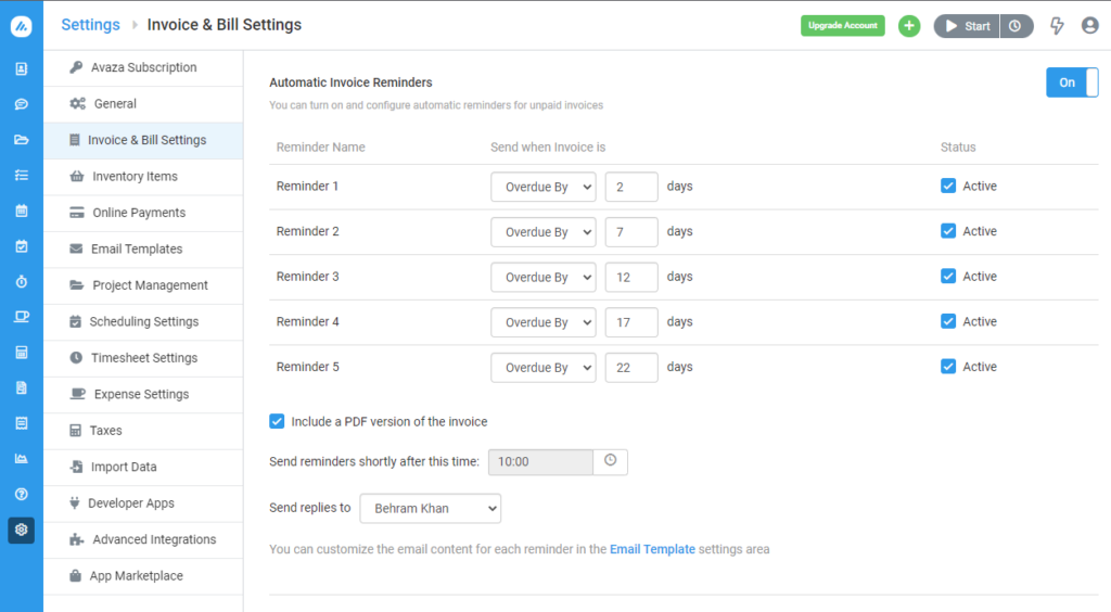 You have the option to include a PDF copy of the invoice, specify the time when the reminder should be sent, and nominate the user who should receive the email replies if your customer decides to reply to the reminder email.
