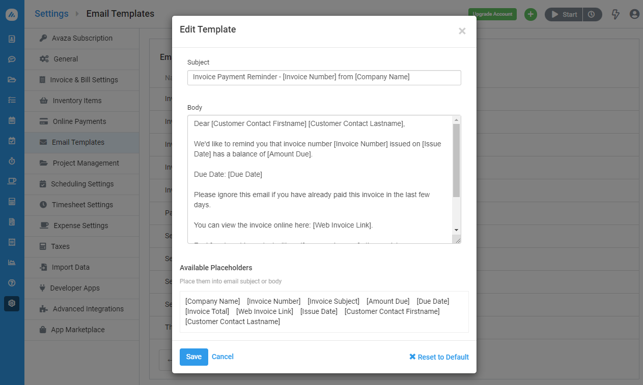 Navigate to Settings > Email Templates page. Here you will find 5 Invoice Auto Reminder email templates corresponding to each reminder you have configured in Step 1. You can customize the subject and body of each email template. Make use of the available variables such as Customer Contact Firstname, Web Invoice Link, Invoice Total, and more.