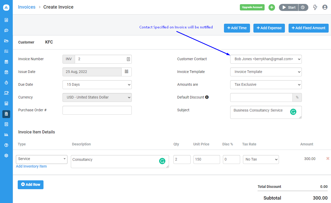 Now that the invoice reminders are switched on, make sure that any new or existing invoice you would like to send invoice auto reminders for has a customer contact specified. The auto-reminders will be sent to the specified contact on the invoice.