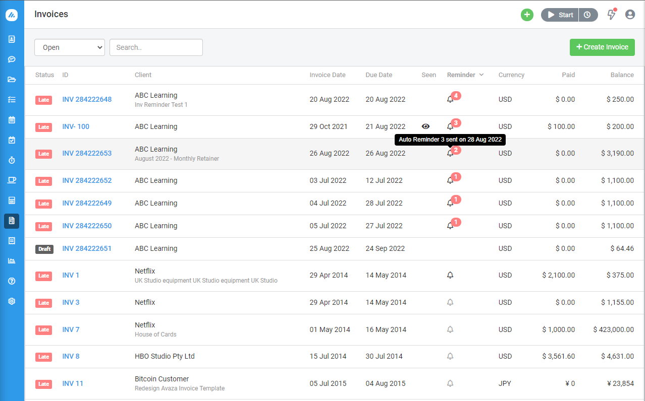 A reminder column is introduced on the Invoice List page to indicate the auto reminder status. Invoices enabled for auto reminders display the count of sent reminders and upon mouseover the last reminder number. A handy feature to easily check the auto reminder status of your invoices.