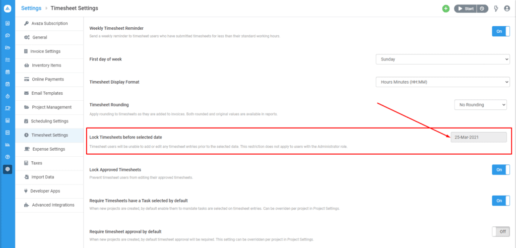 Figure 1 - Timesheet Settings > Lock Timesheets before selected date