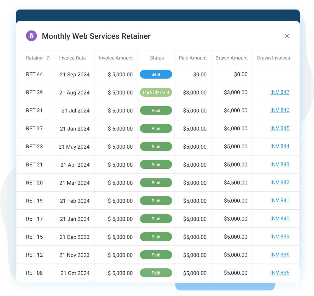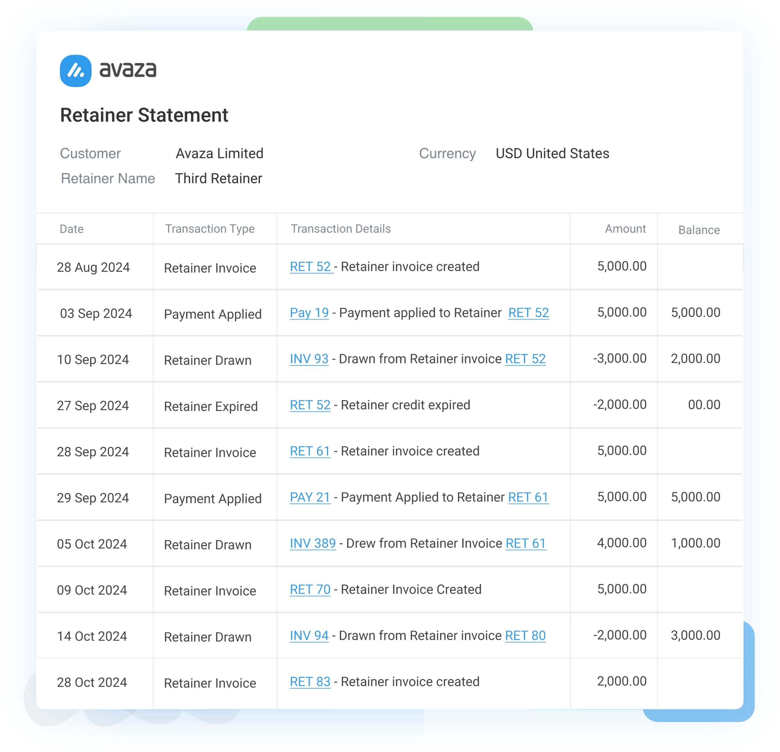 Keep clients informed by regularly generating and sharing retainer statements. These statements provide a complete overview of the retainer activity, including invoices, payments, credits applied, and any expired credits, ensuring transparency and maintaining strong client relationships.