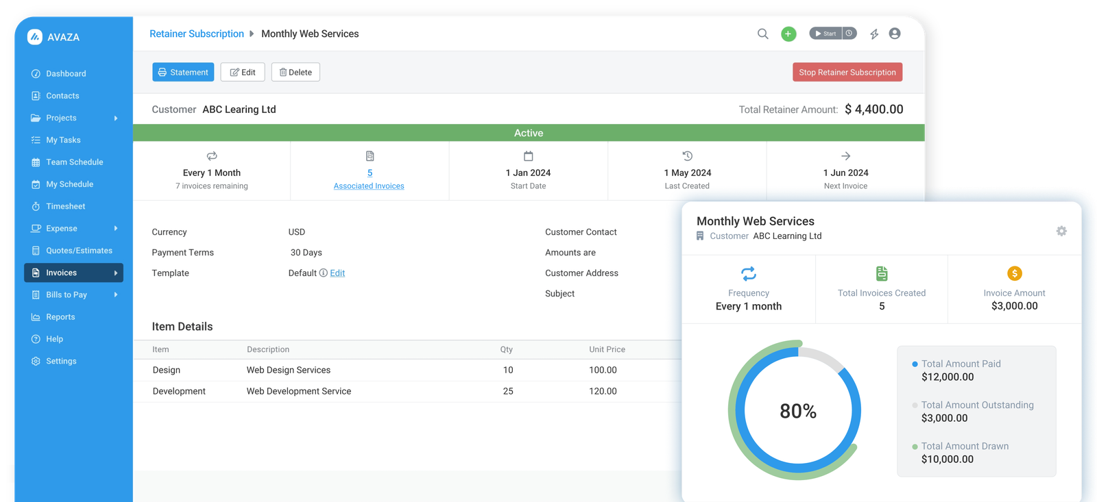 Start by setting up a retainer subscription with a recurring invoicing cycle. Avaza will automatically generate and send retainer invoices on your selected schedule, ensuring consistent and timely requests for advance payments from your clients.