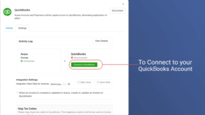 - Once permission to the Avaza account is granted, you will see the details of the Settings screen. Before you can proceed you must connect the integration to one of your Quickbooks accounts.