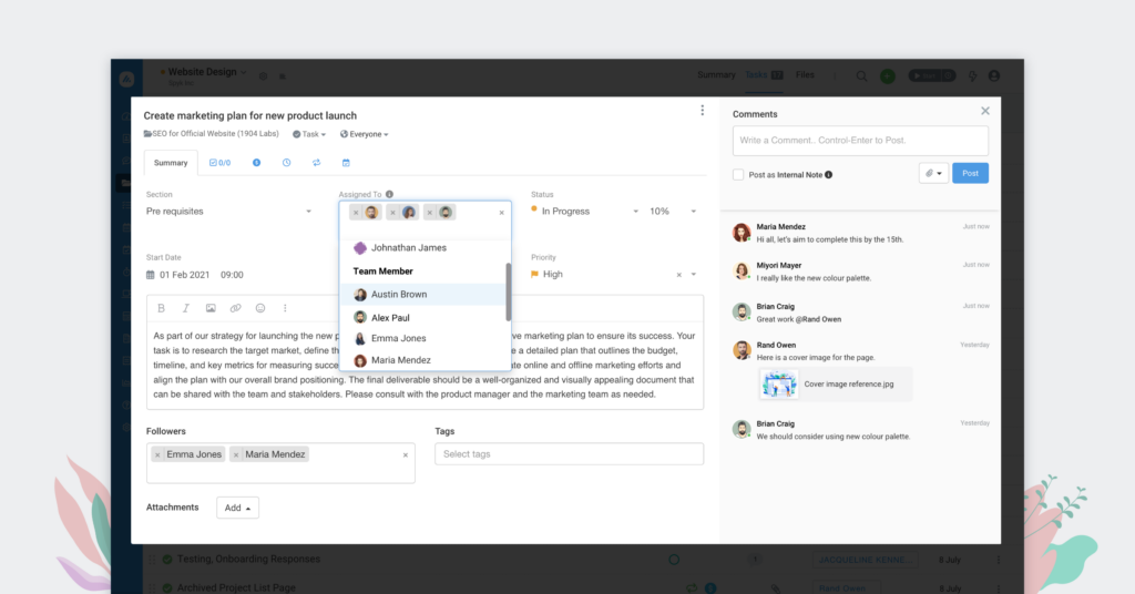 - Assign owners and due dates: Add assignees, set deadlines, and estimate effort directly in the task panel.